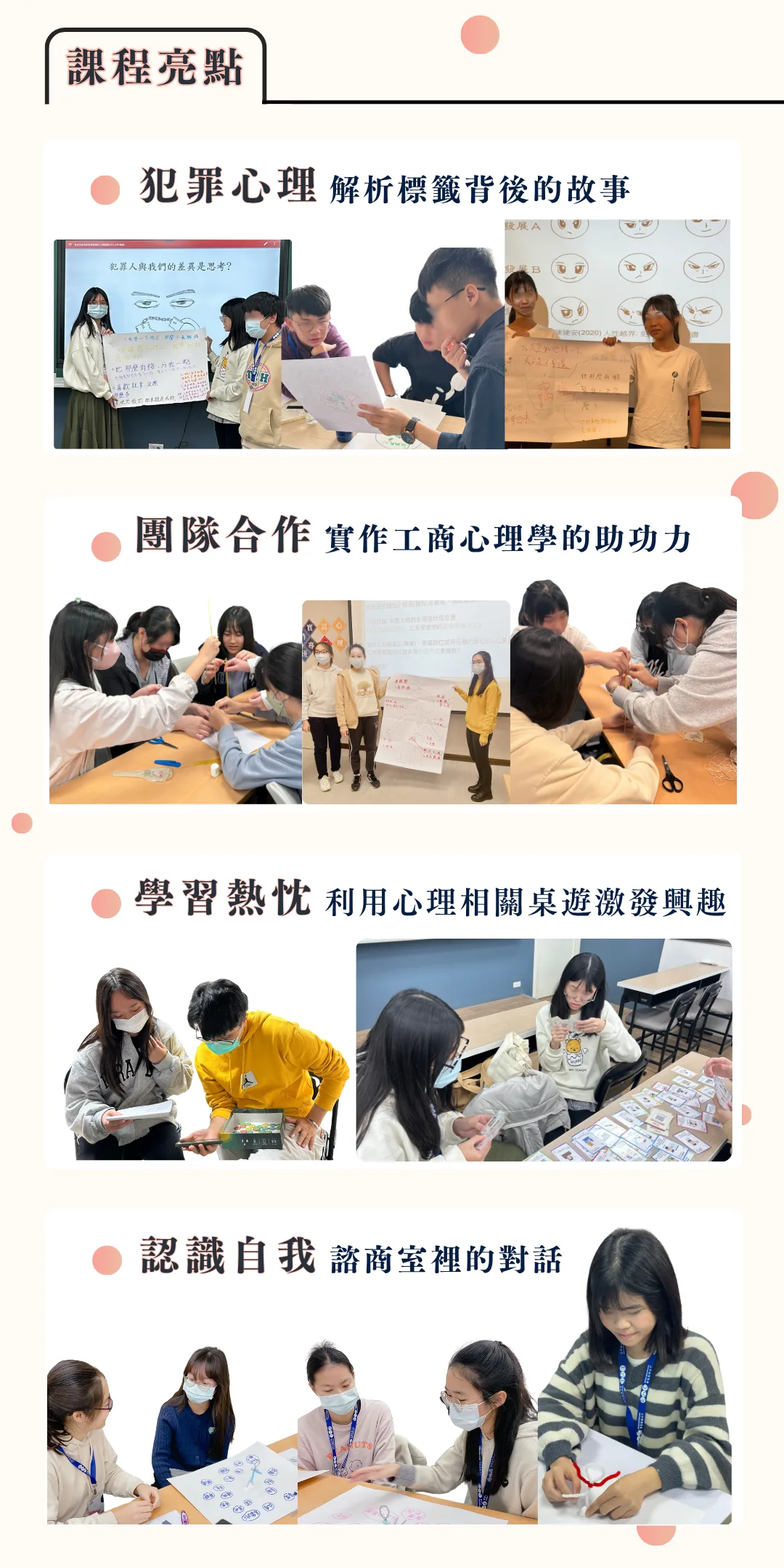| 1505-1625 | 藝術心理 實作:只是聽聽音樂?如何自我照顧與認識自己 音樂治療師 | 教育心理與輔導 實作:你是「調停者」或「鑑賞家」? 用MBTI探索你的獨特之旅。 諮商心理師 |