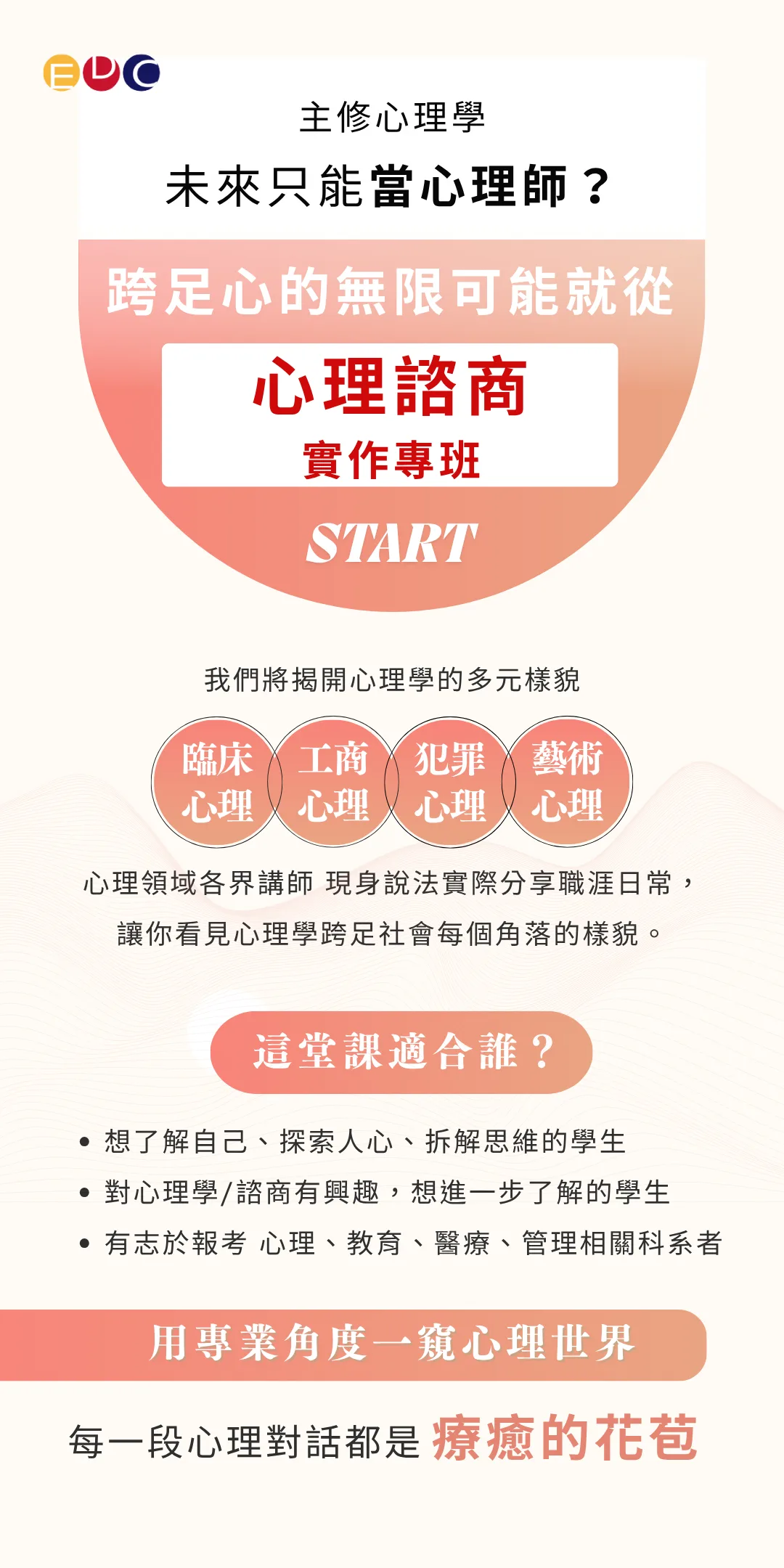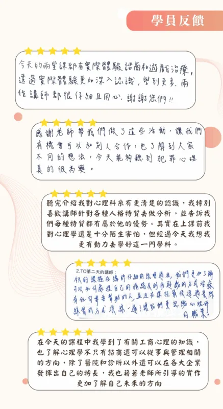 | 1330-1450 | 藝術心理 探索:音樂與我-音樂治療的概念與技巧 音樂治療師 | 教育心理與輔導 探索:運用心理學解讀日常生活與關係 諮商心理師 |