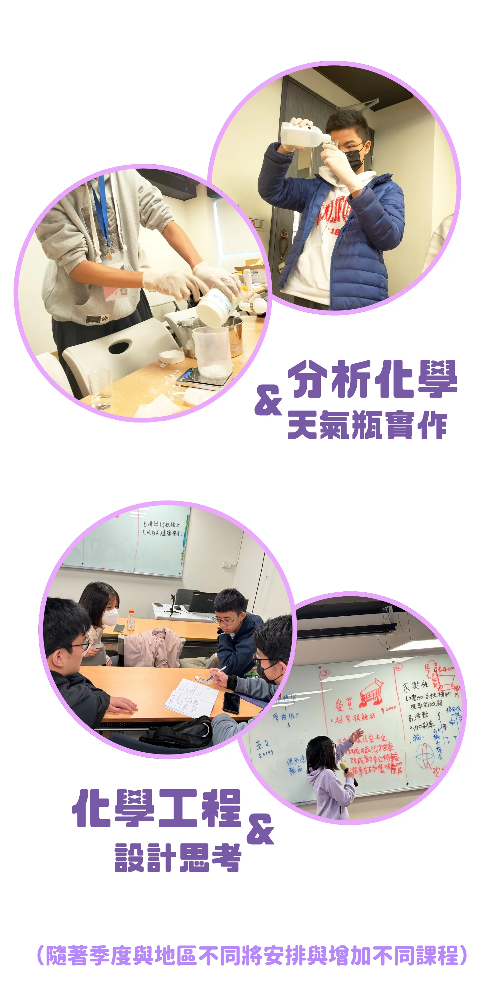 | 1040-1200 | 材料化工 實作:生活中泛用塑膠製品分類及辨識方法實作 鵬富有限公司 經理 | 化學分析 實作:分子神秘面紗-天氣瓶 台積電製程整合工程師 |