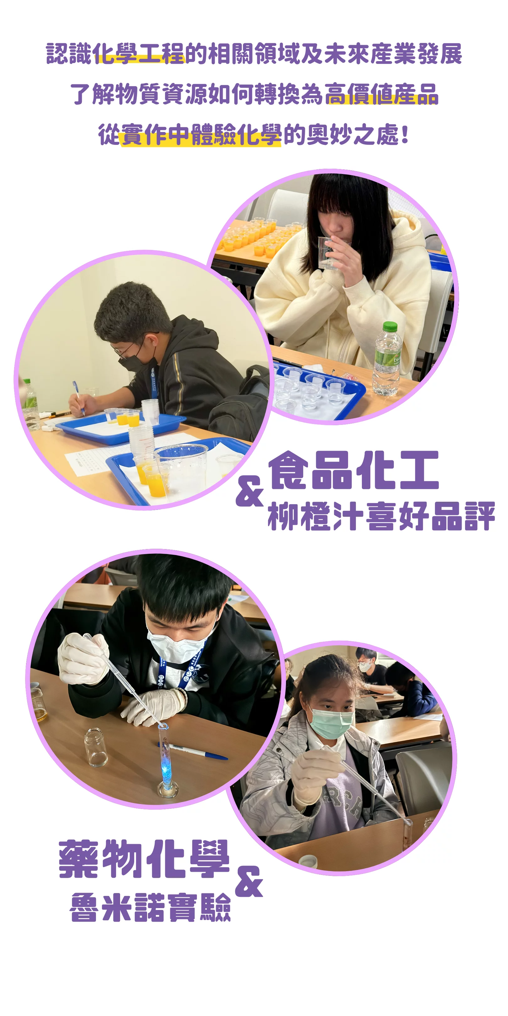 | 1330-1450 | 食品化工 探索:為什麼市面上的飲料顏色、風味都不一樣,原來這就是"品評"! 食品技師 | 香粧藥物化工 探索:原來醫美不只變漂亮!認識醫美儀器原理 崇仁醫護管理專科學校 專任講師 |